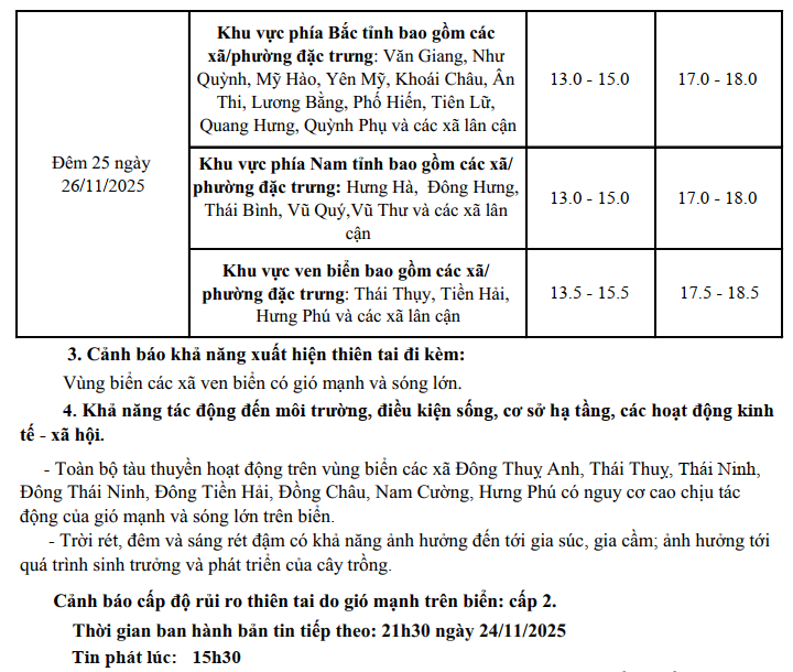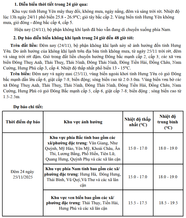TIN KHÔNG KHÍ LẠNH TĂNG CƯỜNG KHU VỰC TỈNH HƯNG YÊN (15h30 NGÀY 24/11/2025)