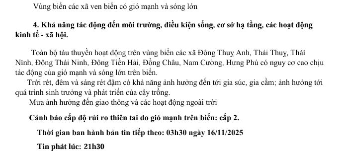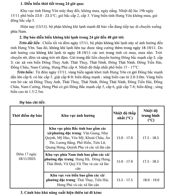 TIN KHÔNG KHÍ LẠNH TĂNG CƯỜNG KHU VỰC TỈNH HƯNG YÊN (21h30 NGÀY 15/11/2025)