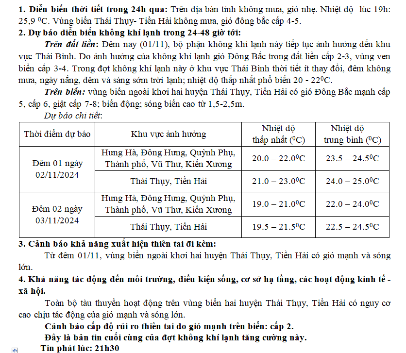 TIN KHÔNG KHÍ LẠNH TĂNG CƯỜNG KHU VỰC TỈNH THÁI BÌNH (21h30 ngày 01/11/2024)