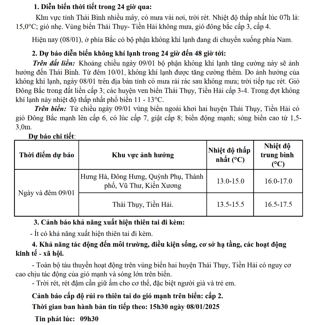 TIN KHÔNG KHÍ LẠNH TĂNG CƯỜNG TỈNH THÁI BÌNH (09h30 ngày 08/01/2025)