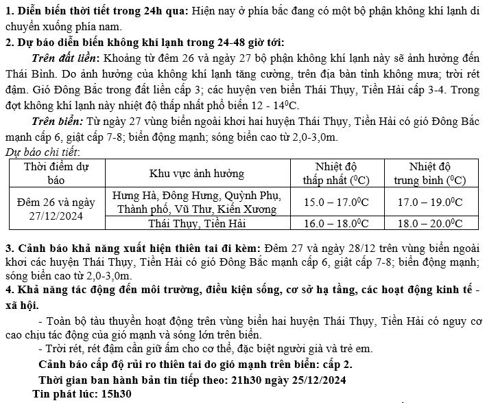 TIN KHÔNG KHÍ LẠNH TĂNG CƯỜNG VÀ RÉT TỈNH THÁI BÌNH (15h30 NGÀY 25/12/2024)
