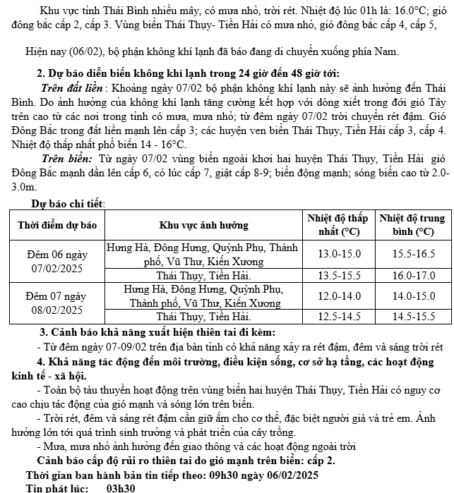 TIN KHÔNG KHÍ LẠNH TĂNG CƯỜNG VÀ RÉT TỈNH THÁI BÌNH (03h30 ngày 06/02/2025)