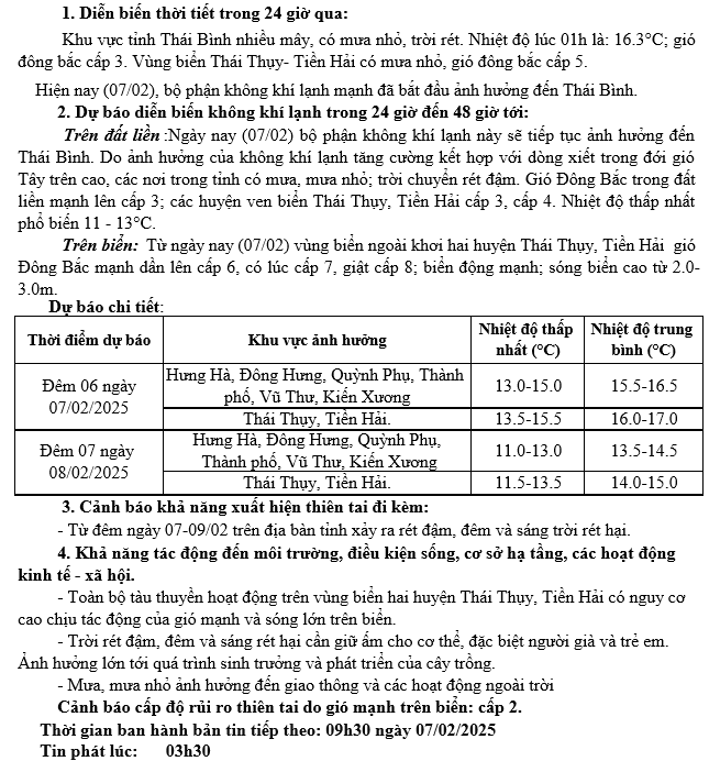 TIN KHÔNG KHÍ LẠNH TĂNG CƯỜNG VÀ RÉT TỈNH THÁI BÌNH (03h30 ngày 07/02/2025)