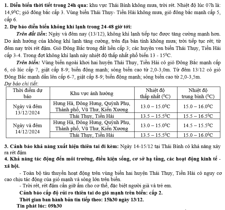 TIN KHÔNG KHÍ LẠNH TĂNG CƯỜNG VÀ RÉT TỈNH THÁI BÌNH (09h30 ngày 13/12/2024)