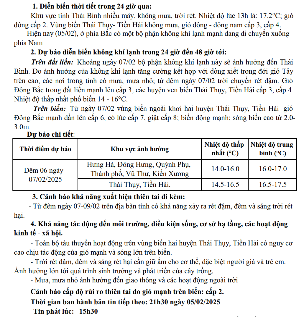 TIN KHÔNG KHÍ LẠNH TĂNG CƯỜNG VÀ RÉT TỈNH THÁI BÌNH (15h30 ngày 05/02/2025)
