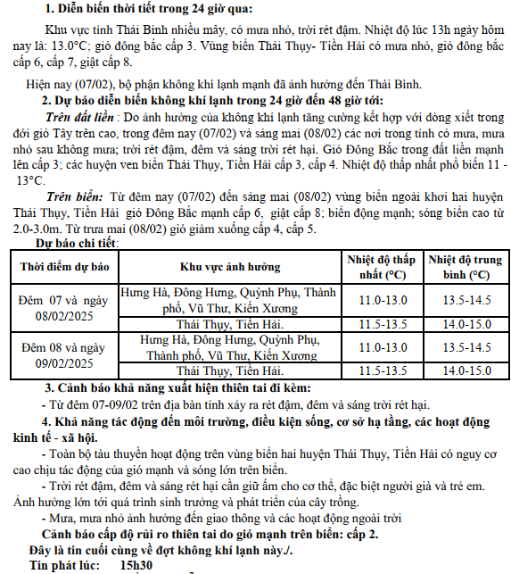 TIN KHÔNG KHÍ LẠNH TĂNG CƯỜNG VÀ RÉT TỈNH THÁI BÌNH (15h30 ngày 07/02/2025)