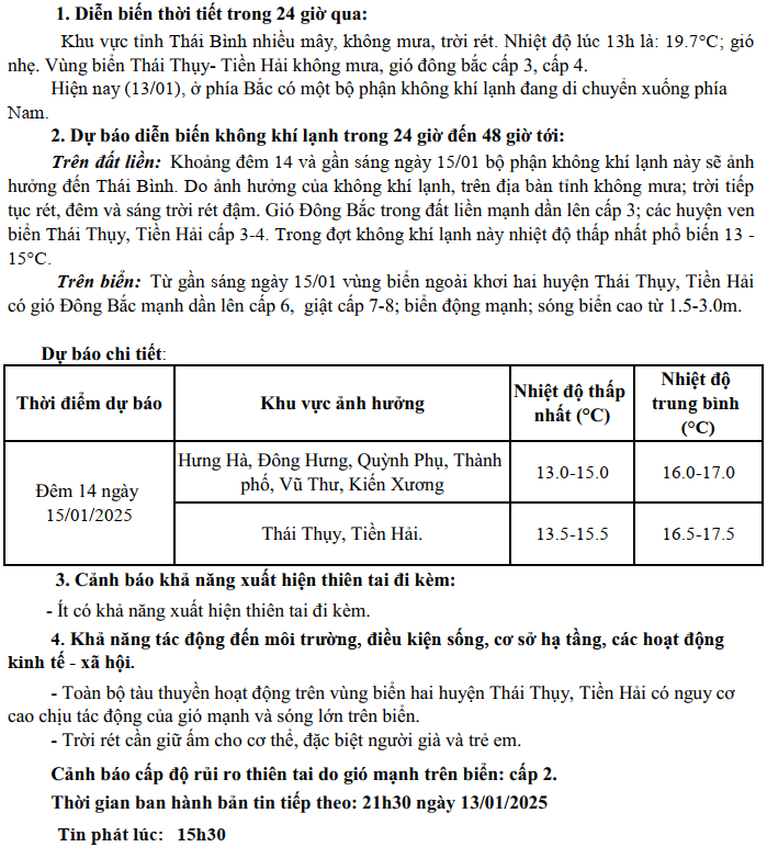 TIN KHÔNG KHÍ LẠNH TĂNG CƯỜNG VÀ RÉT TỈNH THÁI BÌNH (15h30 ngày 13/01/2025)