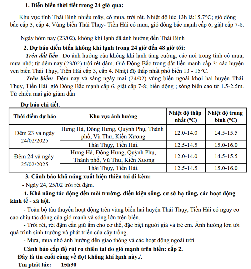 TIN KHÔNG KHÍ LẠNH TĂNG CƯỜNG VÀ RÉT TỈNH THÁI BÌNH (15h30 ngày 23/02/2025)