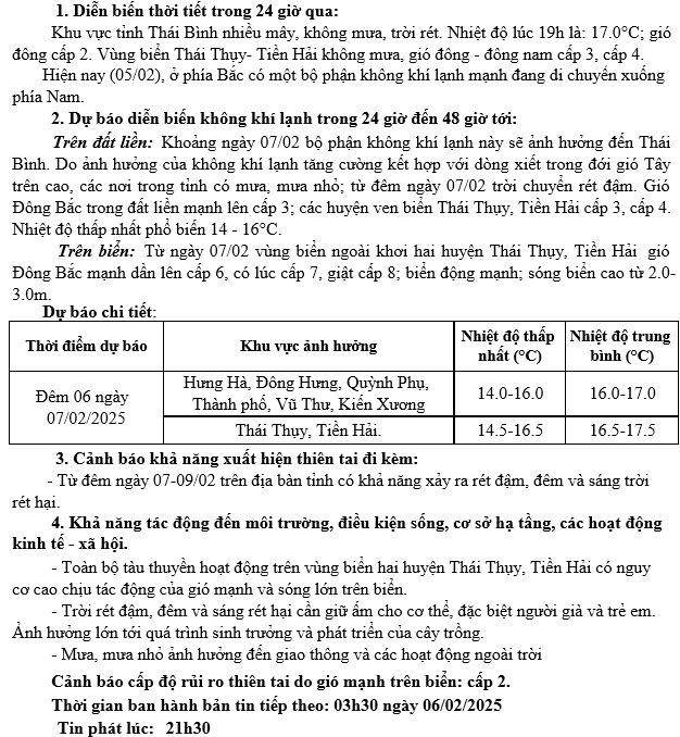 TIN KHÔNG KHÍ LẠNH TĂNG CƯỜNG VÀ RÉT TỈNH THÁI BÌNH (21h30 ngày 05/02/2025)