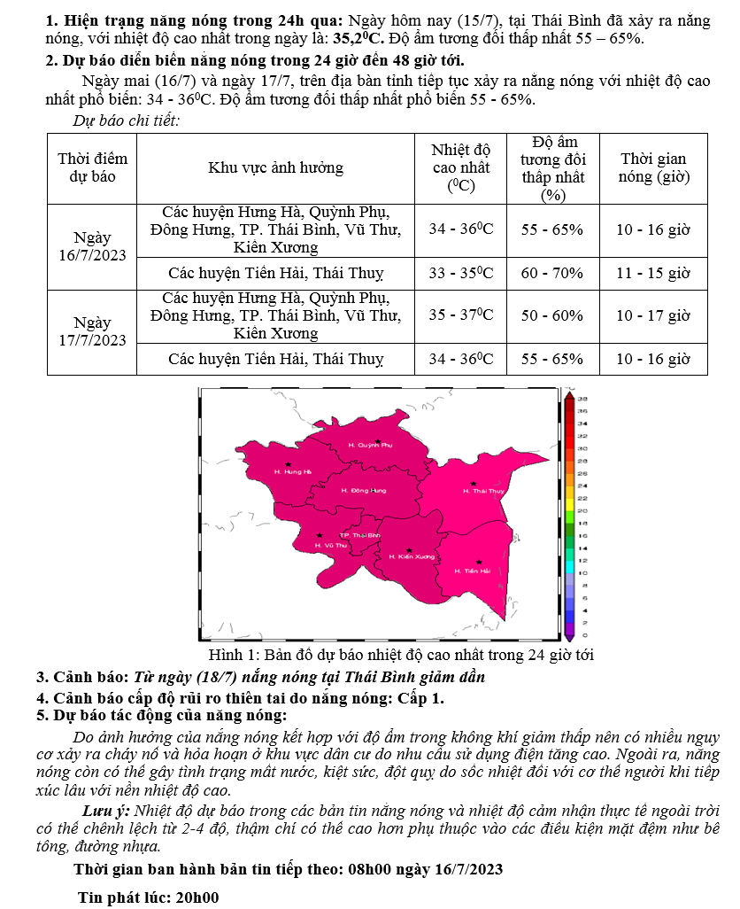 TIN DỰ BÁO NẮNG NÓNG KHU VỰC THÁI BÌNH (20h NGÀY 15/7/2023)