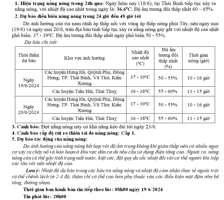 TIN DỰ BÁO NẮNG NÓNG KHU VỰC THÁI BÌNH (20h00 NGÀY 18/6/2024)