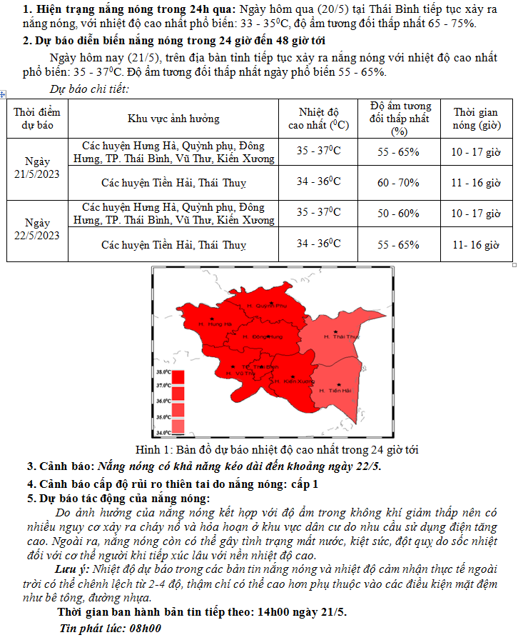 TIN DỰ BÁO NẮNG NÓNG KHU VỰC TỈNH THÁI BÌNH (08h NGÀY 21/5/2023)
