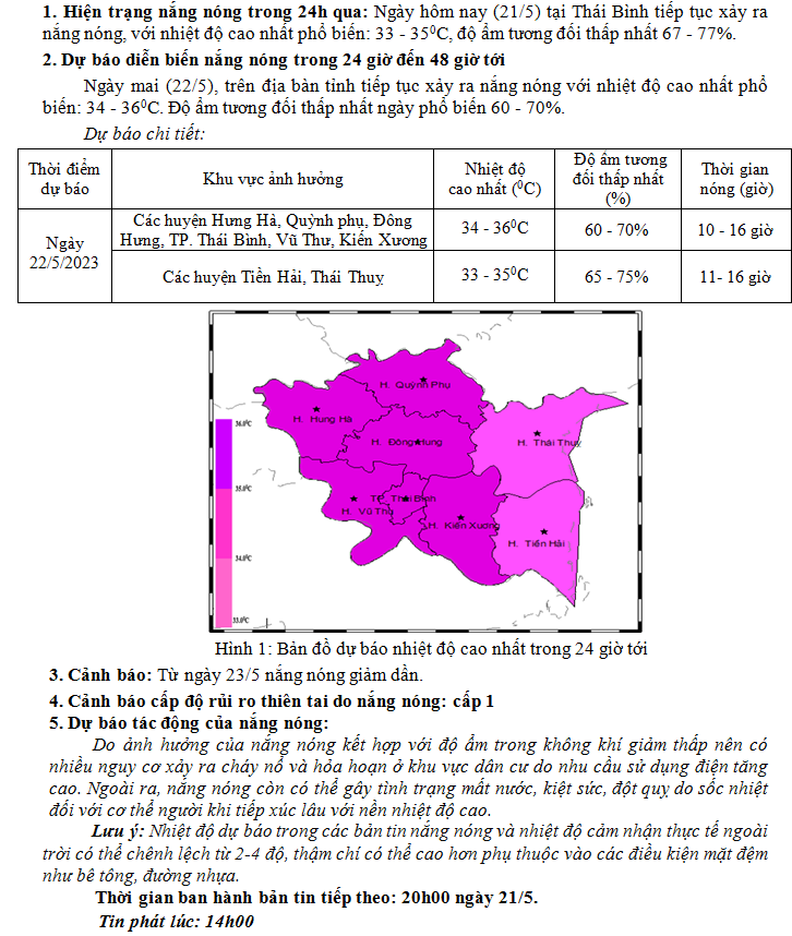 TIN DỰ BÁO NẮNG NÓNG KHU VỰC TỈNH THÁI BÌNH (14h NGÀY 21/5/2023)