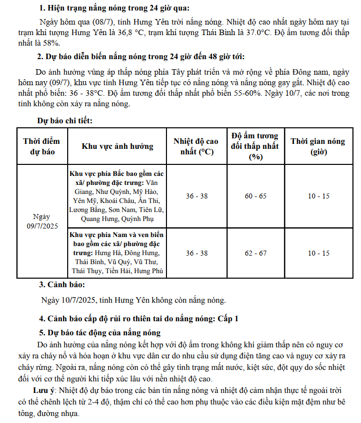 TIN DỰ BÁO NẮNG NÓNG TỈNH HƯNG YÊN (08h00 NGÀY 09/7/2025)