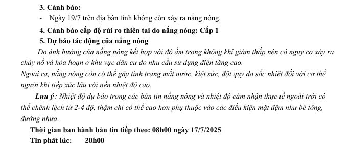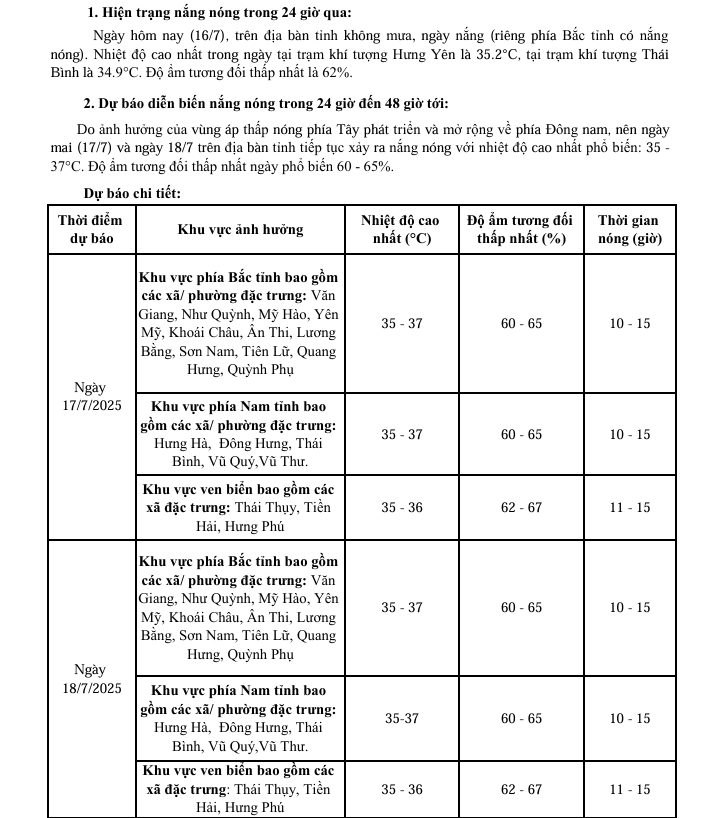 TIN DỰ BÁO NẮNG NÓNG TỈNH HƯNG YÊN (20h00 NGÀY 16/7/2025)