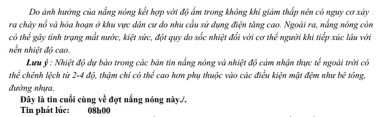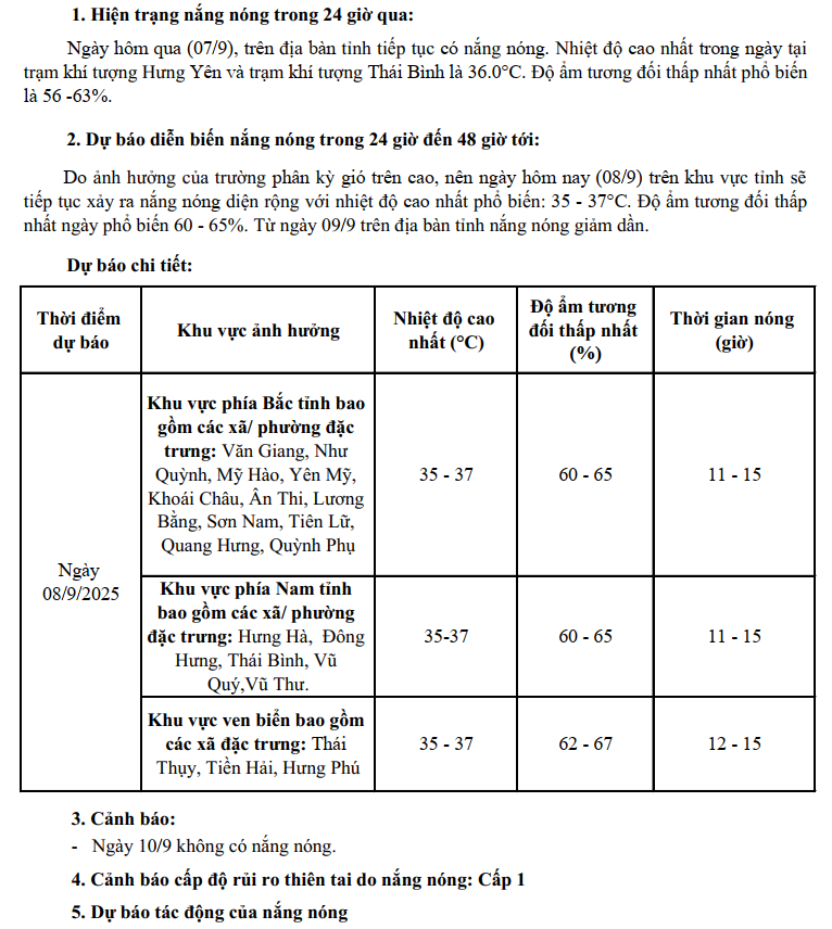 TIN DỰ BÁO NẮNG NÓNG TỈNH HƯNG YÊN (8h00 ngày 08/9/2025)