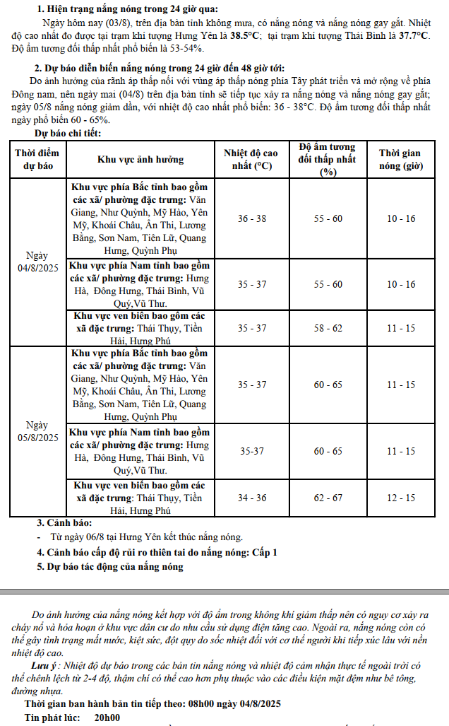 TIN DỰ BÁO NẮNG NÓNG TỈNH HƯNG YÊN (phát lúc 20h ngày 03/8/2025)