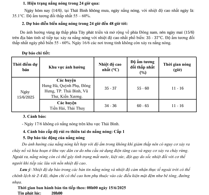 TIN DỰ BÁO NẮNG NÓNG TỈNH THÁI BÌNH (20h00 NGÀY 14/6/2025)