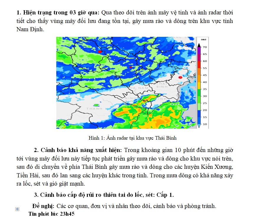 TIN CẢNH BÁO DÔNG, LỐC, SÉT KHU VỰC TỈNH THÁI BÌNH NGÀY 18/7/2023 (Lần 1)