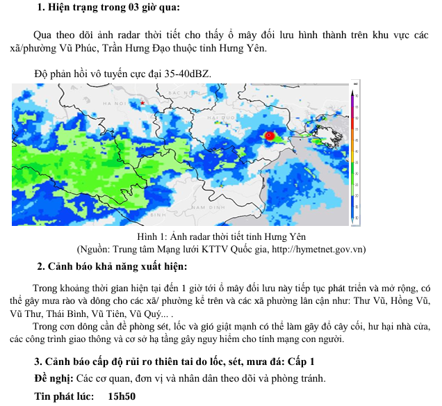 TIN CẢNH BÁO DÔNG, LỐC, SÉT, MƯA ĐÁ VÀ MƯA LỚN CỤC BỘ TỈNH HƯNG YÊN (lần 4)