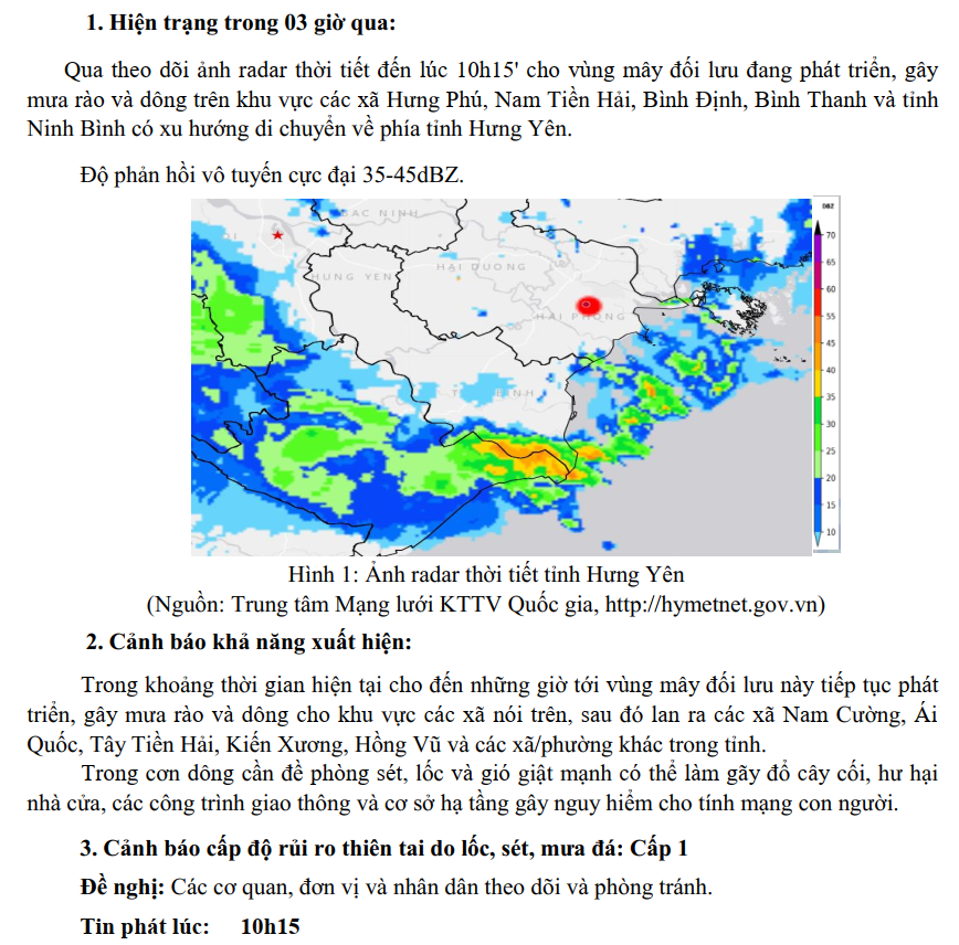 TIN CẢNH BÁO DÔNG, LỐC, SÉT, MƯA ĐÁ VÀ MƯA LỚN CỤC BỘ TỈNH HƯNG YÊN ( NGÀY 01/9/2025-Lần 3)