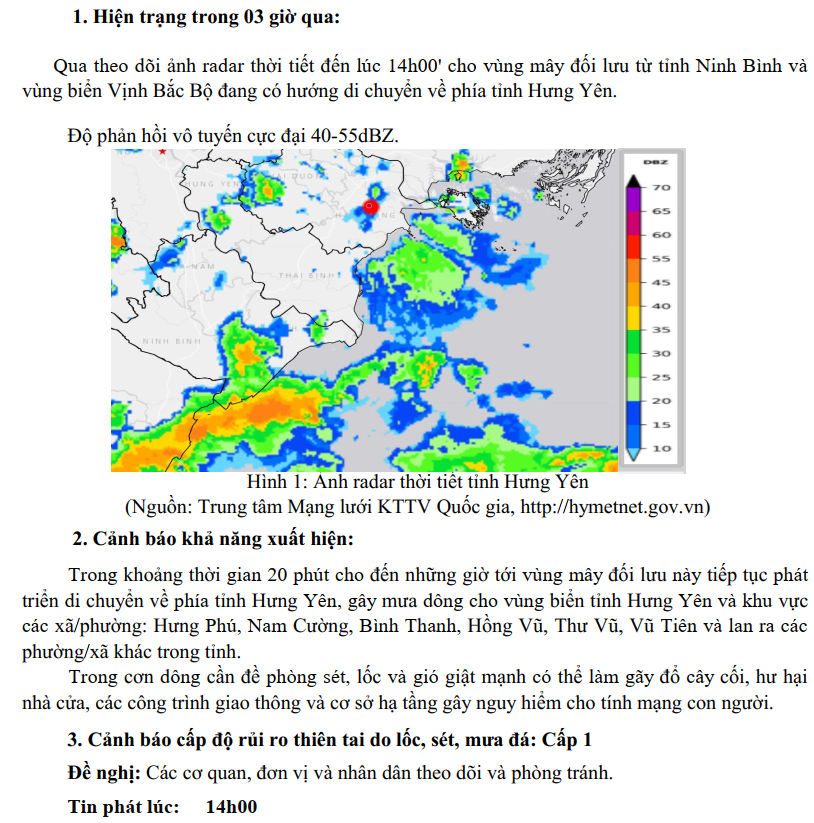 TIN CẢNH BÁO DÔNG, LỐC, SÉT, MƯA ĐÁ VÀ MƯA LỚN CỤC BỘ TỈNH HƯNG YÊN ( NGÀY 30/8/2025-Lần 1)
