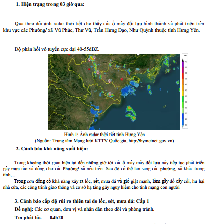 TIN CẢNH BÁO DÔNG, LỐC, SÉT, MƯA ĐÁ VÀ MƯA LỚN CỤC BỘ TỈNH HƯNG YÊN (LẦN 1)