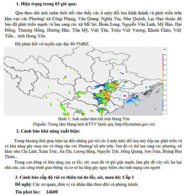 TIN CẢNH BÁO DÔNG, LỐC, SÉT, MƯA ĐÁ VÀ MƯA LỚN CỤC BỘ TỈNH HƯNG YÊN (LẦN 3)