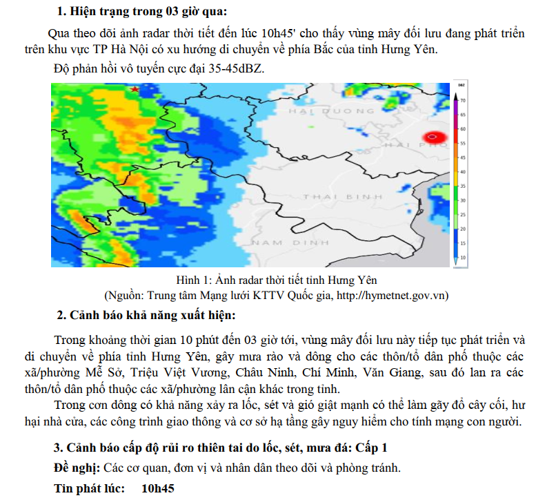 TIN CẢNH BÁO DÔNG, LỐC, SÉT, MƯA ĐÁ VÀ MƯA LỚN CỤC BỘ TỈNH HƯNG YÊN (NGÀY 07/10/2025-Lần 2)