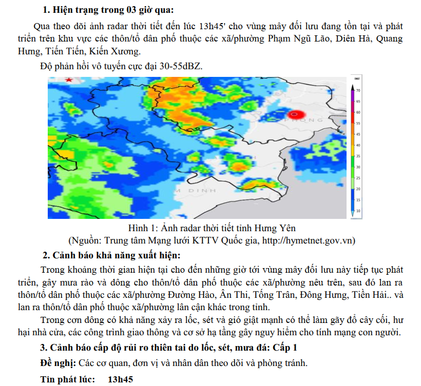 TIN CẢNH BÁO DÔNG, LỐC, SÉT, MƯA ĐÁ VÀ MƯA LỚN CỤC BỘ TỈNH HƯNG YÊN (NGÀY 07/10/2025-Lần 3)