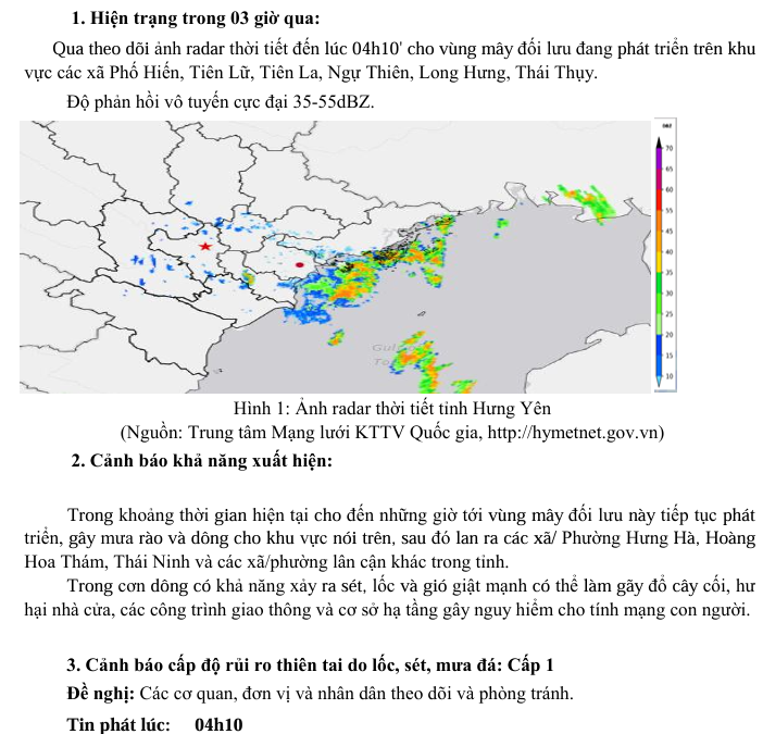 TIN CẢNH BÁO DÔNG, LỐC, SÉT, MƯA ĐÁ VÀ MƯA LỚN CỤC BỘ TỈNH HƯNG YÊN (NGÀY 10/9/2025-Lần 1)