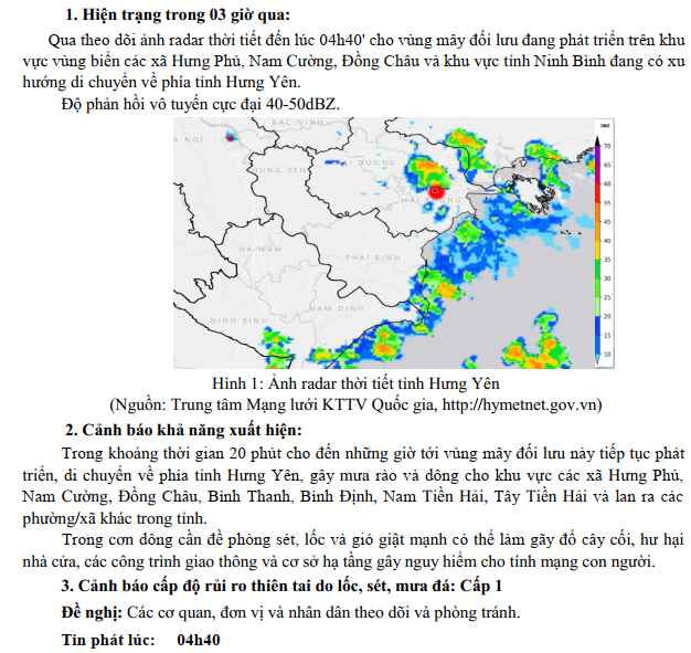 TIN CẢNH BÁO DÔNG, LỐC, SÉT, MƯA ĐÁ VÀ MƯA LỚN CỤC BỘ TỈNH HƯNG YÊN (NGÀY 13/8/2024-Lần 1)