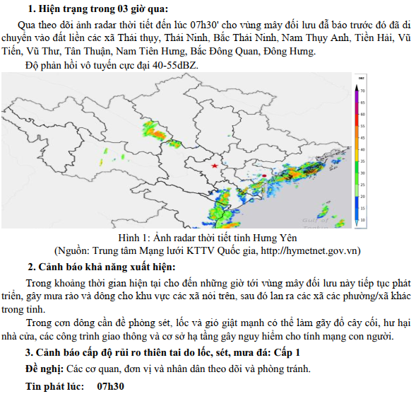 TIN CẢNH BÁO DÔNG, LỐC, SÉT, MƯA ĐÁ VÀ MƯA LỚN CỤC BỘ TỈNH HƯNG YÊN (NGÀY 13/8/2024-Lần 2)