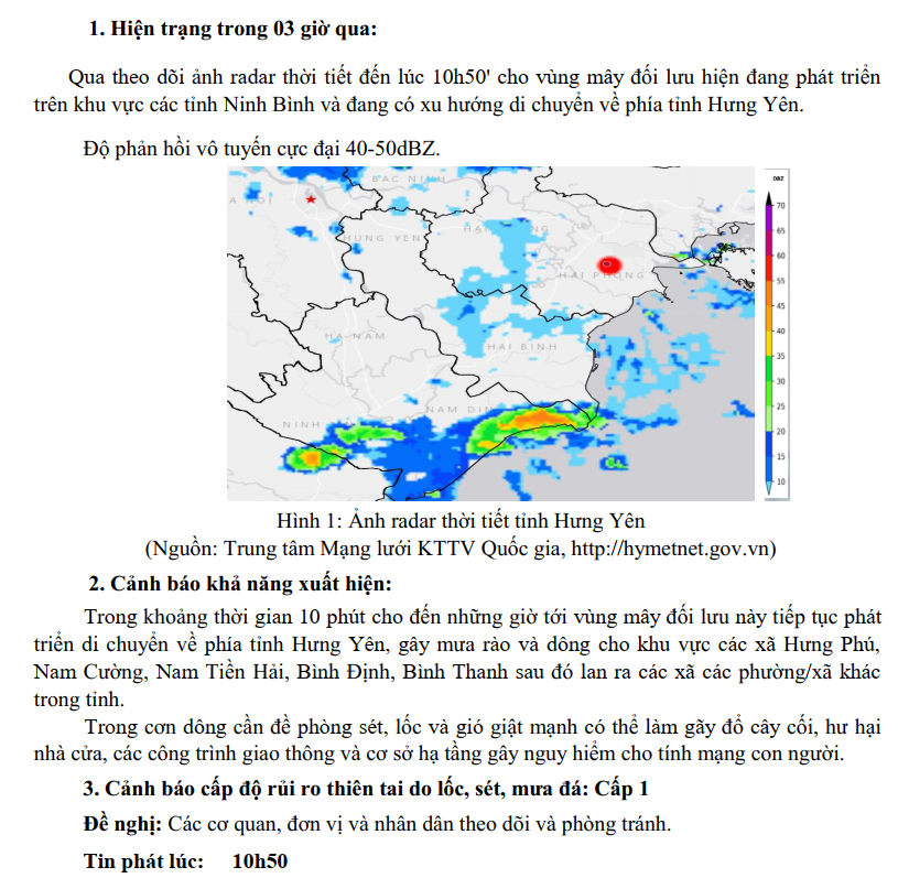 TIN CẢNH BÁO DÔNG, LỐC, SÉT, MƯA ĐÁ VÀ MƯA LỚN CỤC BỘ TỈNH HƯNG YÊN (NGÀY 14/8/2024-Lần 1)
