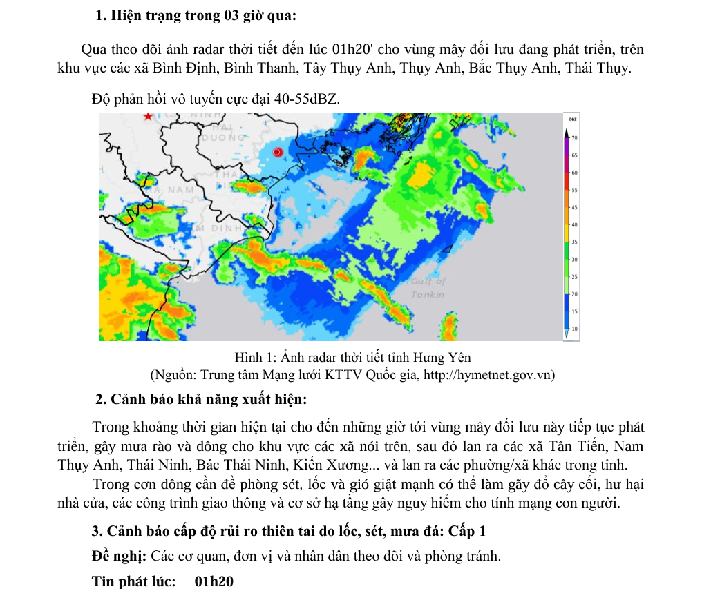TIN CẢNH BÁO DÔNG, LỐC, SÉT, MƯA ĐÁ VÀ MƯA LỚN CỤC BỘ TỈNH HƯNG YÊN (NGÀY 16/8/2024-Lần 1)