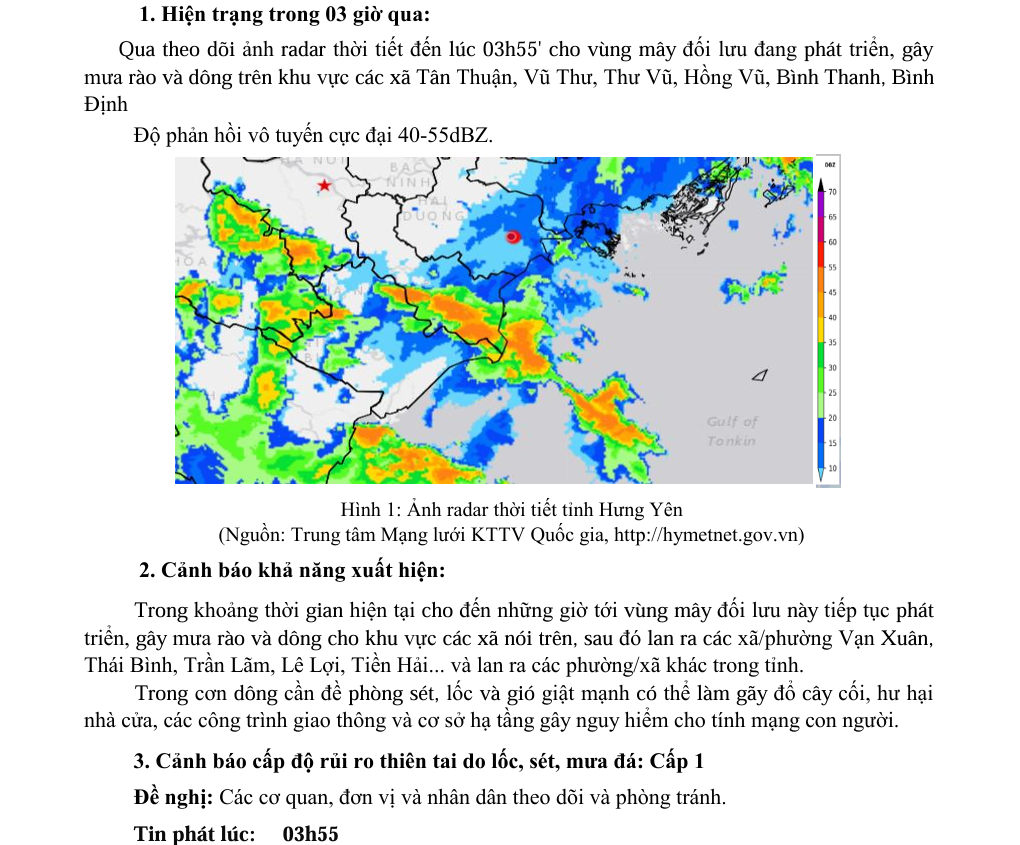 TIN CẢNH BÁO DÔNG, LỐC, SÉT, MƯA ĐÁ VÀ MƯA LỚN CỤC BỘ TỈNH HƯNG YÊN (NGÀY 16/8/2025-Lần 3)
