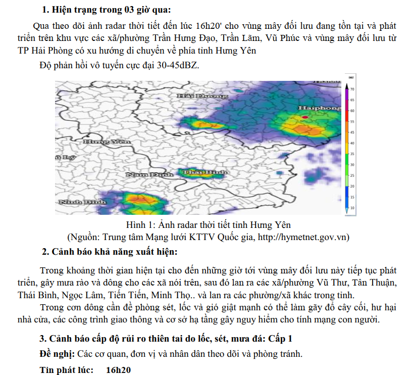 TIN CẢNH BÁO DÔNG, LỐC, SÉT, MƯA ĐÁ VÀ MƯA LỚN CỤC BỘ TỈNH HƯNG YÊN (NGÀY 16/9/2025-Lần 3)