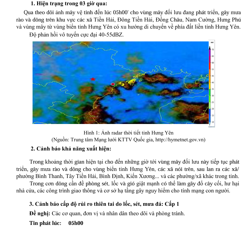 TIN CẢNH BÁO DÔNG, LỐC, SÉT, MƯA ĐÁ VÀ MƯA LỚN CỤC BỘ TỈNH HƯNG YÊN (NGÀY 18/9/2025-Lần 1)
