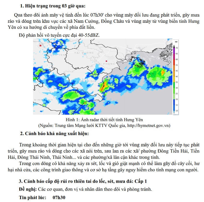 TIN CẢNH BÁO DÔNG, LỐC, SÉT, MƯA ĐÁ VÀ MƯA LỚN CỤC BỘ TỈNH HƯNG YÊN (NGÀY 18/9/2025-Lần 2)