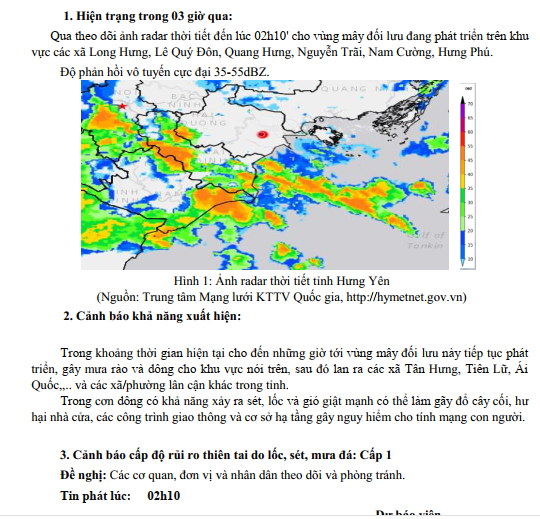 TIN CẢNH BÁO DÔNG, LỐC, SÉT, MƯA ĐÁ VÀ MƯA LỚN CỤC BỘ TỈNH HƯNG YÊN (NGÀY 22/9/2025-Lần 1)