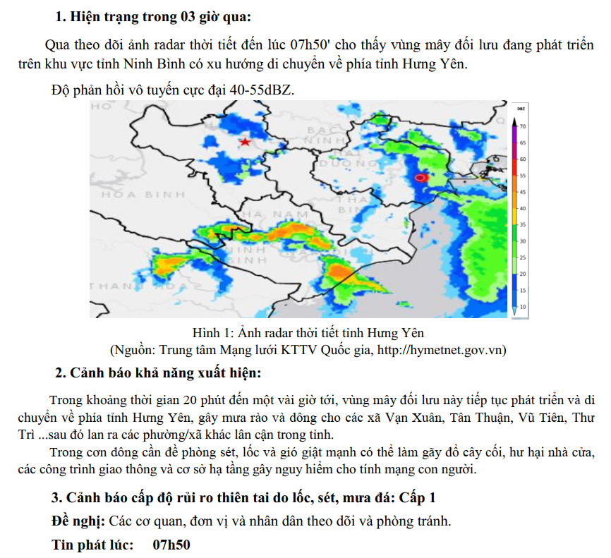 TIN CẢNH BÁO DÔNG, LỐC, SÉT, MƯA ĐÁ VÀ MƯA LỚN CỤC BỘ TỈNH HƯNG YÊN (NGÀY 23/8/2025-Lần 3)