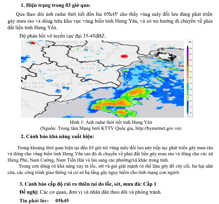 TIN CẢNH BÁO DÔNG, LỐC, SÉT, MƯA ĐÁ VÀ MƯA LỚN CỤC BỘ TỈNH HƯNG YÊN (NGÀY 23/9/2025-Lần 1)