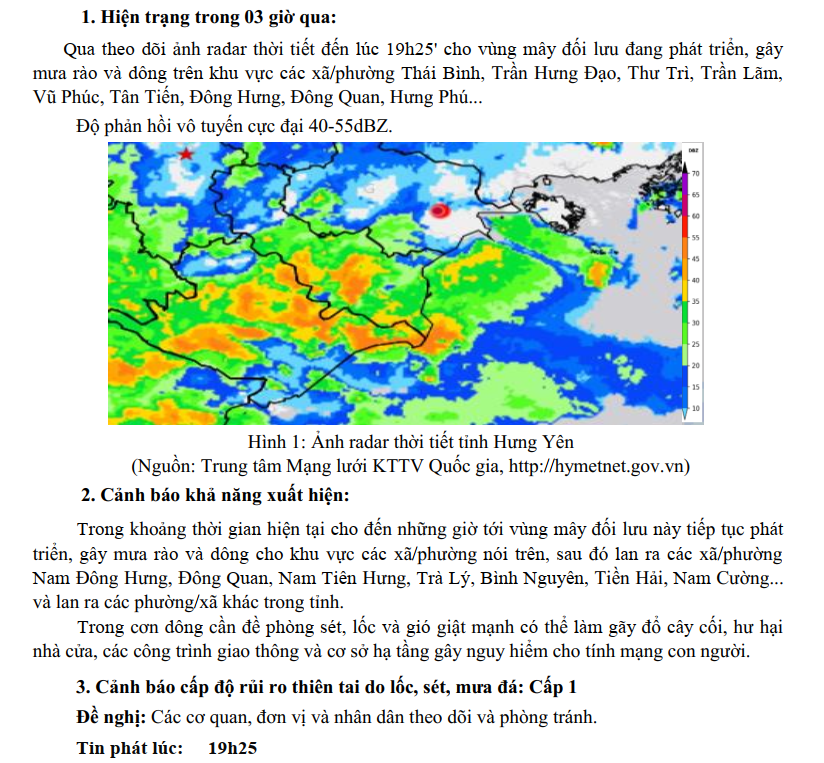 TIN CẢNH BÁO DÔNG, LỐC, SÉT, MƯA ĐÁ VÀ MƯA LỚN CỤC BỘ TỈNH HƯNG YÊN (NGÀY 25/8/2025-Lần 3)