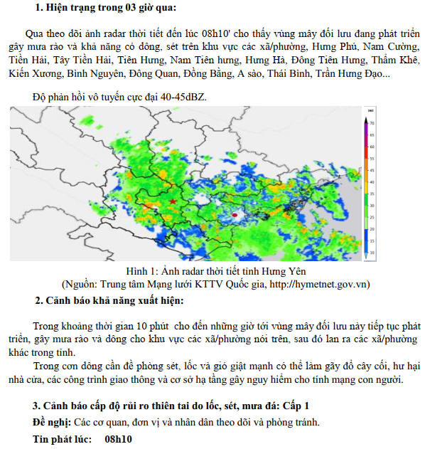 TIN CẢNH BÁO DÔNG, LỐC, SÉT, MƯA ĐÁ VÀ MƯA LỚN CỤC BỘ TỈNH HƯNG YÊN (NGÀY 27/8/2025-Lần 2)