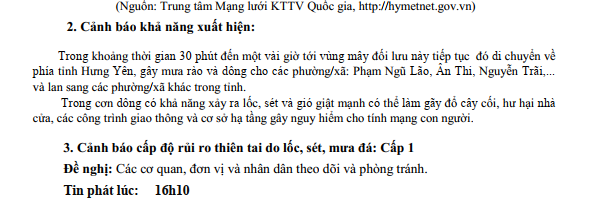 TIN CẢNH BÁO DÔNG, LỐC, SÉT, MƯA ĐÁ VÀ MƯA LỚN CỤC BỘ TỈNH HƯNG YÊN, NGÀY 27/9/2025-Lần 2