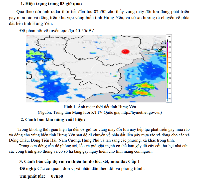 TIN CẢNH BÁO DÔNG, LỐC, SÉT, MƯA ĐÁ VÀ MƯA LỚN CỤC BỘ TỈNH HƯNG YÊN (NGÀY 28/8/2025-Lần 2)