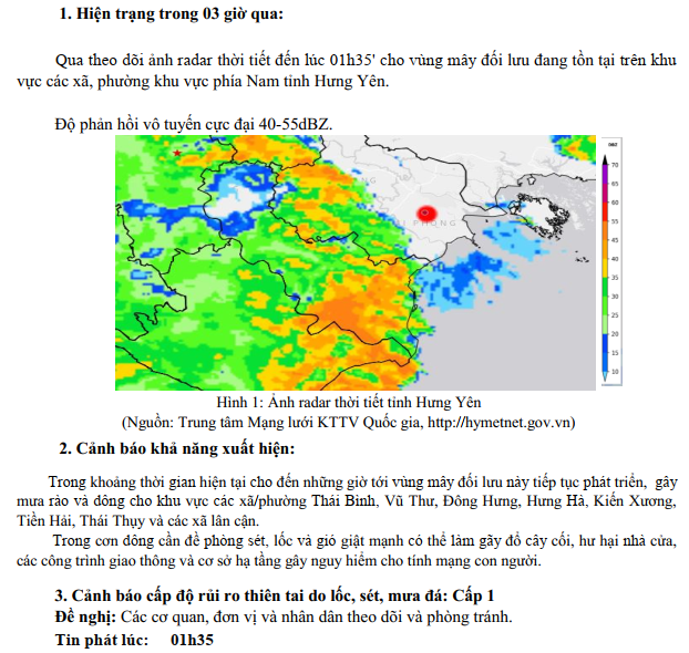 TIN CẢNH BÁO DÔNG, LỐC, SÉT, MƯA ĐÁ VÀ MƯA LỚN CỤC BỘ TRÊN KHU VỰC TỈNH HƯNG YÊN (ngày 01/7/2025 - Lần 1)
