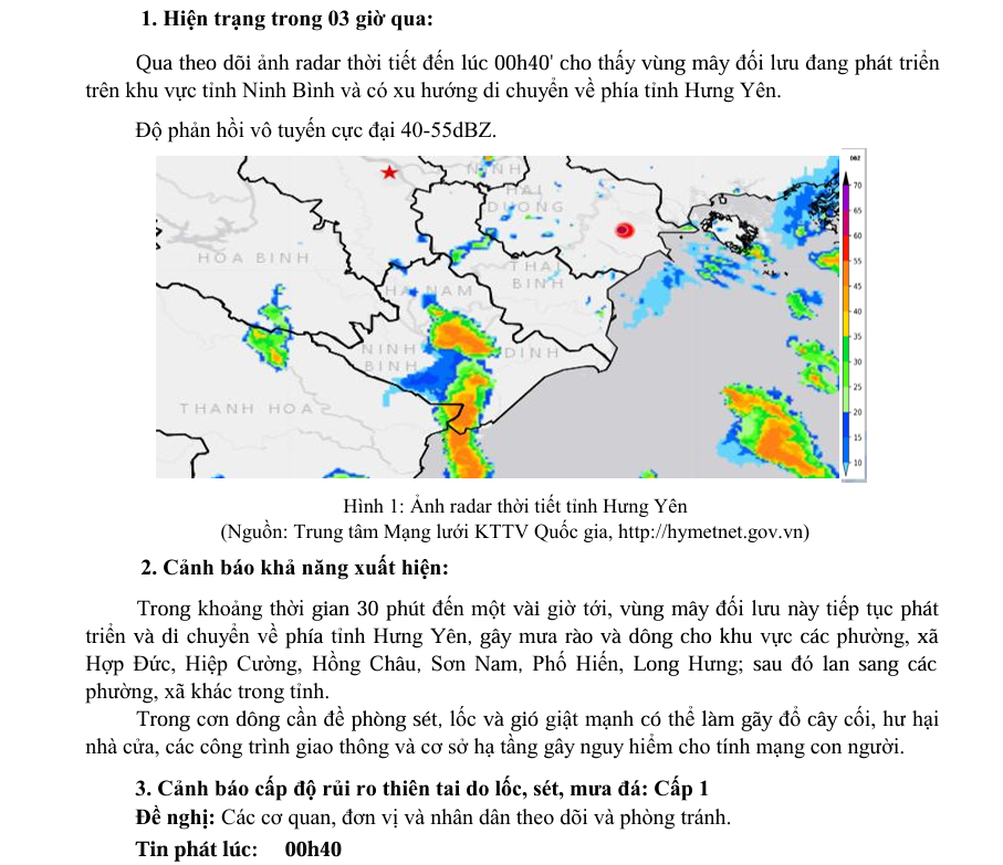 TIN CẢNH BÁO DÔNG, LỐC, SÉT, MƯA ĐÁ VÀ MƯA LỚN CỤC BỘ TRÊN KHU VỰC TỈNH HƯNG YÊN (ngày 02/7/2025 - Lần 1)