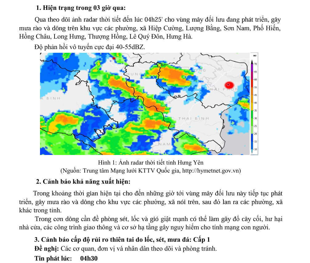 TIN CẢNH BÁO DÔNG, LỐC, SÉT, MƯA ĐÁ VÀ MƯA LỚN CỤC BỘ TRÊN KHU VỰC TỈNH HƯNG YÊN (ngày 02/7/2025 - Lần 2)