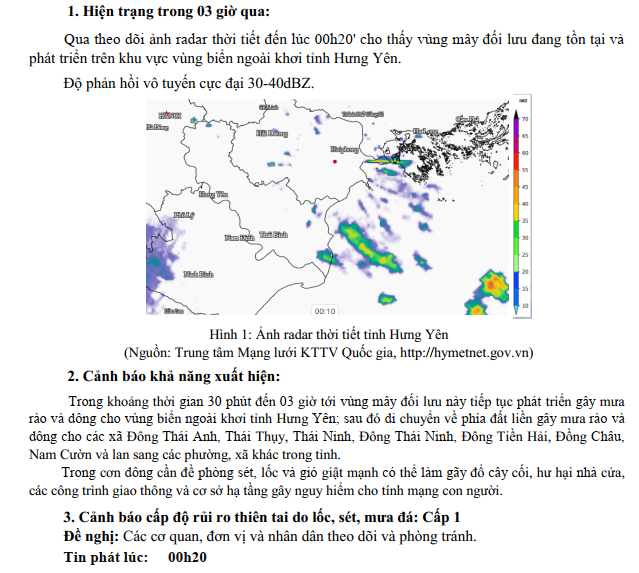 TIN CẢNH BÁO DÔNG, LỐC, SÉT, MƯA ĐÁ VÀ MƯA LỚN CỤC BỘ TRÊN KHU VỰC TỈNH HƯNG YÊN (ngày 04/7/2025 - Lần 1)